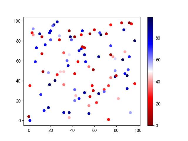 # 以下三行代码使编译器支持绘图功能: import sys import matplotlib matplotlib.use('Agg') import matplotlib.pyplot as plt import numpy as np # 生成随机数据: x = np.random.randint(100, size=(100)) y = np.random.randint(100, size=(100)) colors = np.random.randint(100, size=(100)) # 使用 seismic 反向配色方案创建散点图: plt.scatter(x, y, c=colors, cmap='seismic_r') plt.colorbar() plt.show() # 以下两行代码使编译器能够输出图形: plt.savefig(sys.stdout.buffer) sys.stdout.flush()