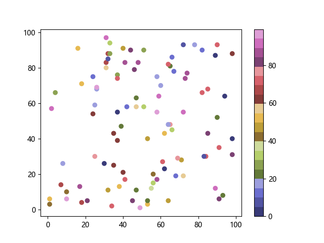 # 以下三行代码使编译器支持绘图功能: import sys import matplotlib matplotlib.use('Agg') import matplotlib.pyplot as plt import numpy as np # 生成随机数据: x = np.random.randint(100, size=(100)) y = np.random.randint(100, size=(100)) colors = np.random.randint(100, size=(100)) # 使用 tab20b 离散配色方案创建散点图: plt.scatter(x, y, c=colors, cmap='tab20b') plt.colorbar() plt.show() # 以下两行代码使编译器能够输出图形: plt.savefig(sys.stdout.buffer) sys.stdout.flush()