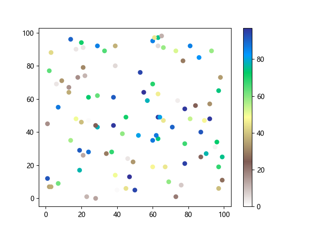 # 以下三行代码使编译器支持绘图功能: import sys import matplotlib matplotlib.use('Agg') import matplotlib.pyplot as plt import numpy as np # 生成随机数据: x = np.random.randint(100, size=(100)) y = np.random.randint(100, size=(100)) colors = np.random.randint(100, size=(100)) # 使用地形反向 (terrain_r) 配色方案创建散点图: plt.scatter(x, y, c=colors, cmap='terrain_r') plt.colorbar() plt.show() # 以下两行代码使编译器能够输出图形: plt.savefig(sys.stdout.buffer) sys.stdout.flush()