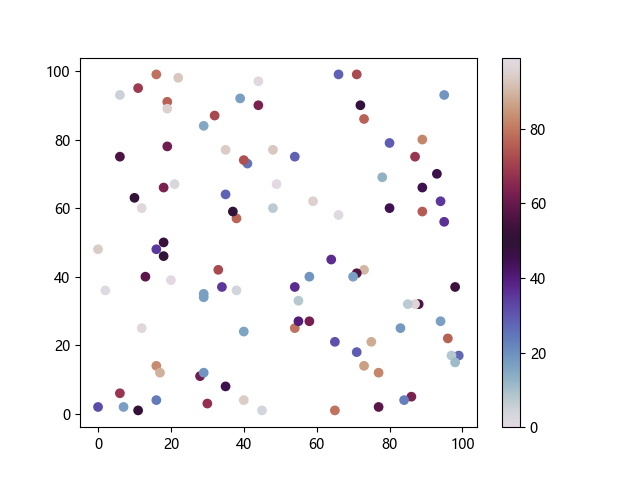 # 以下三行代码使编译器支持绘图功能: import sys import matplotlib matplotlib.use('Agg') import matplotlib.pyplot as plt import numpy as np # 生成随机数据: x = np.random.randint(100, size=(100)) y = np.random.randint(100, size=(100)) colors = np.random.randint(100, size=(100)) # 使用 twilight 配色方案创建散点图: plt.scatter(x, y, c=colors, cmap='twilight') plt.colorbar() plt.show() # 以下两行代码使编译器能够输出图形: plt.savefig(sys.stdout.buffer) sys.stdout.flush()