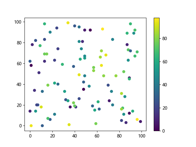 # 以下三行代码使编译器支持绘图功能: import sys import matplotlib matplotlib.use('Agg') import matplotlib.pyplot as plt import numpy as np # 生成随机数据: x = np.random.randint(100, size=(100)) y = np.random.randint(100, size=(100)) colors = np.random.randint(100, size=(100)) # 使用 viridis 配色方案创建散点图: plt.scatter(x, y, c=colors, cmap='viridis') plt.colorbar() plt.show() # 以下两行代码使编译器能够输出图形: plt.savefig(sys.stdout.buffer) sys.stdout.flush()