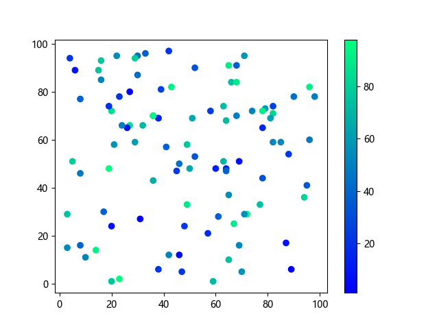 # 以下三行代码使编译器支持绘图功能: import sys import matplotlib matplotlib.use('Agg') import matplotlib.pyplot as plt import numpy as np # 生成随机数据: x = np.random.randint(100, size=(100)) y = np.random.randint(100, size=(100)) colors = np.random.randint(100, size=(100)) # 使用冬季 (winter) 配色方案创建散点图: plt.scatter(x, y, c=colors, cmap='winter') plt.colorbar() plt.show() # 以下两行代码使编译器能够输出图形: plt.savefig(sys.stdout.buffer) sys.stdout.flush()