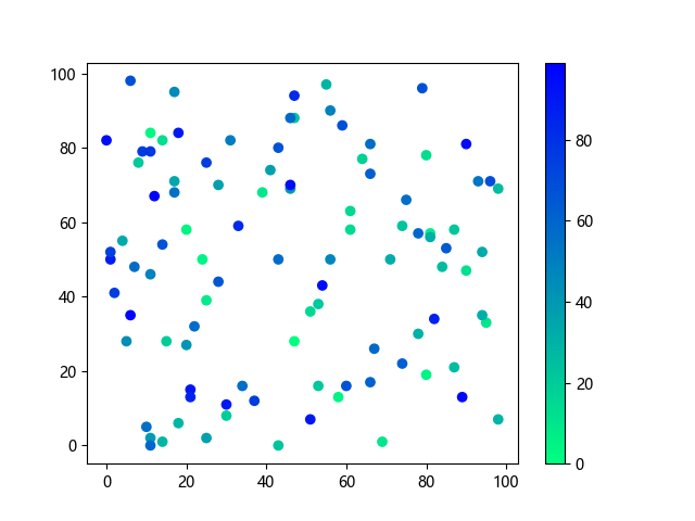 # 以下三行代码使编译器支持绘图功能: import sys import matplotlib matplotlib.use('Agg') import matplotlib.pyplot as plt import numpy as np # 生成随机数据: x = np.random.randint(100, size=(100)) y = np.random.randint(100, size=(100)) colors = np.random.randint(100, size=(100)) # 使用冬季反向 (winter_r) 配色方案创建散点图: plt.scatter(x, y, c=colors, cmap='winter_r') plt.colorbar() plt.show() # 以下两行代码使编译器能够输出图形: plt.savefig(sys.stdout.buffer) # 将图形保存到标准输出缓冲区 sys.stdout.flush() # 刷新输出缓冲区