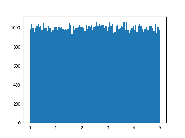 # 使编译器支持绘图的三行配置: import sys import matplotlib matplotlib.use('Agg') import numpy import matplotlib.pyplot as plt x = numpy.random.uniform(0.0, 5.0, 100000) plt.hist(x, 100) plt.show() # 实现编译器绘图功能的两行代码: plt.savefig(sys.stdout.buffer) sys.stdout.flush()
